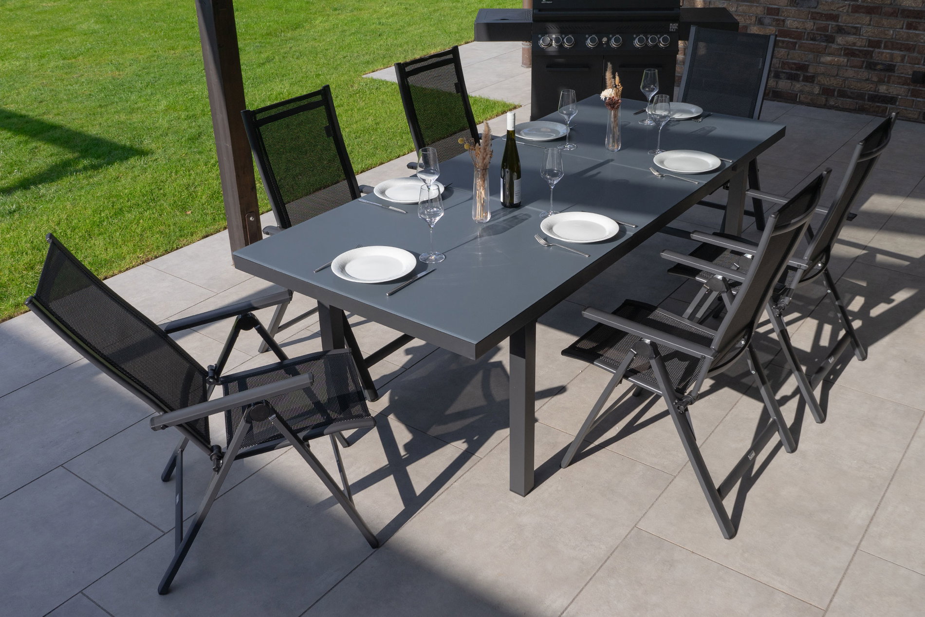 OUTFLEXX Premium Garten-Essgruppe, anthrazit matt, Alu/Textilene, Tisch 180/240x100cm, 6 Klappstühle