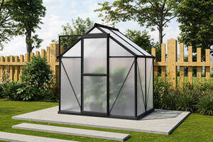 OUTFLEXX Verde Gewächshaus, schwarzer Rahmen, Aluminium/Polycarbonat, 130x183x190 cm, pulverbeschichtet, UV-geschützt, mit Schiebetür