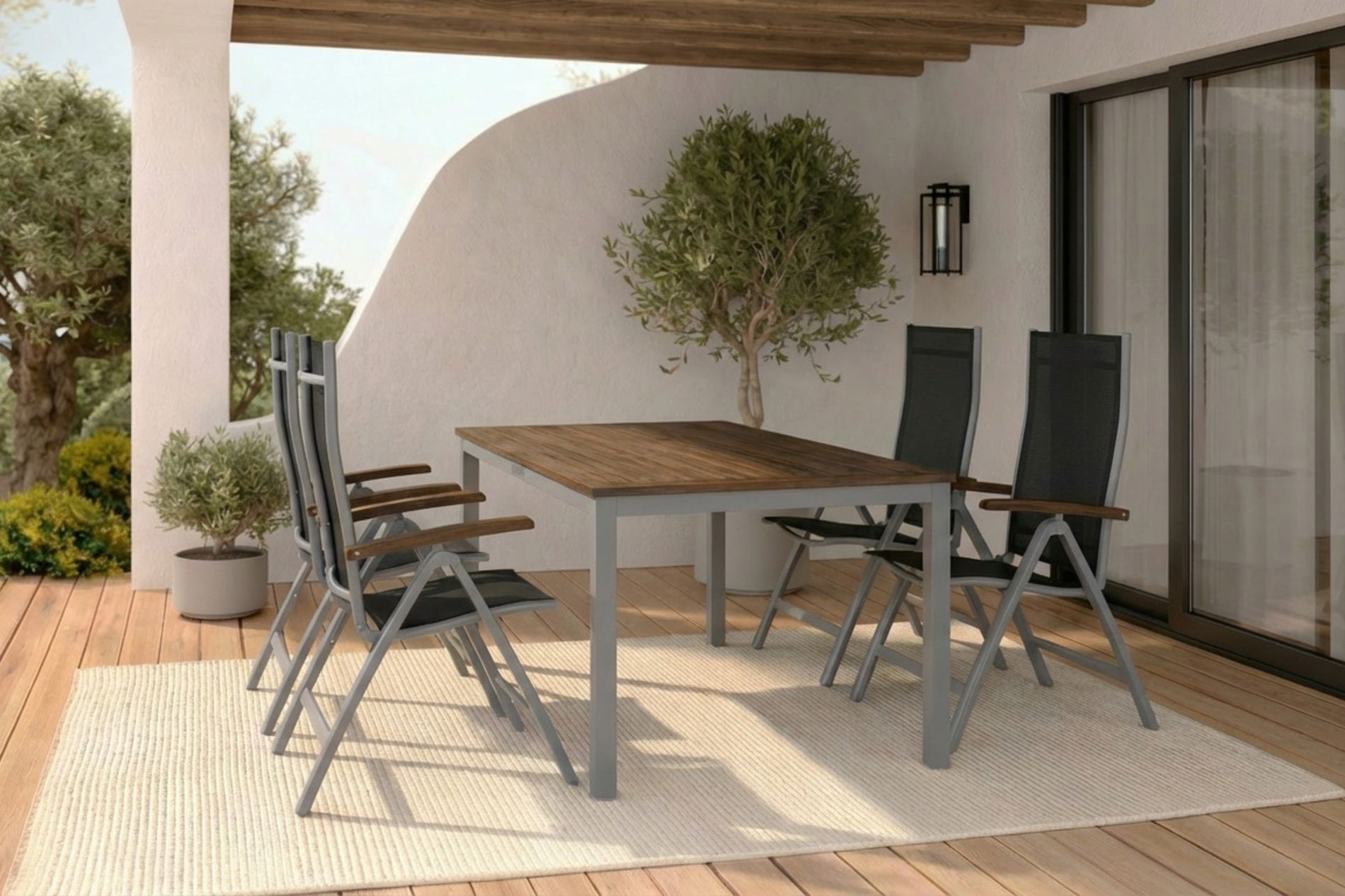 VILLANA Garten-Essgruppe, silber/schwarz, Alu / Akazie, Gartentisch 150 x 90 cm, 4 Klappstühle, FSC®-zertifiziertes Produkt