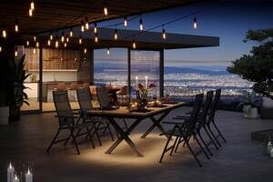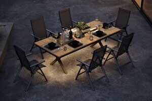 OUTFLEXX Luminara Garten-Essgruppe mit LED-Beleuchtung, anthrazit matt/natur, Aluminium/Textilen/Holzimitat, Tisch 240 x 100 cm, 6 Klappstühle