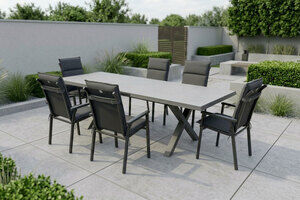 KETTLER BasicPlus Pro Garten-Essgruppe, anthrazit/schwarz, Alu/Steinimitat/Polyester, 200/260x100cm, 6 Stapelsessel, inkl Auflagen