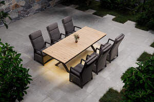OUTFLEXX Luminara Garten-Essgruppe mit LED-Beleuchtung, anthrazit/natur, Aluminium/Polyrattan/Holzimitat, Tisch 240 x 100 cm, 6 Sessel
