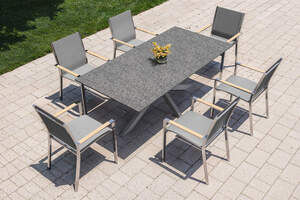 OUTFLEXX Montreal Garten-Essgruppe, schwarz/grau, Edelstahl/Textilene, 200 x 100 cm, stapelbar, Armlehnen aus Teak, inkl. 6 Sessel