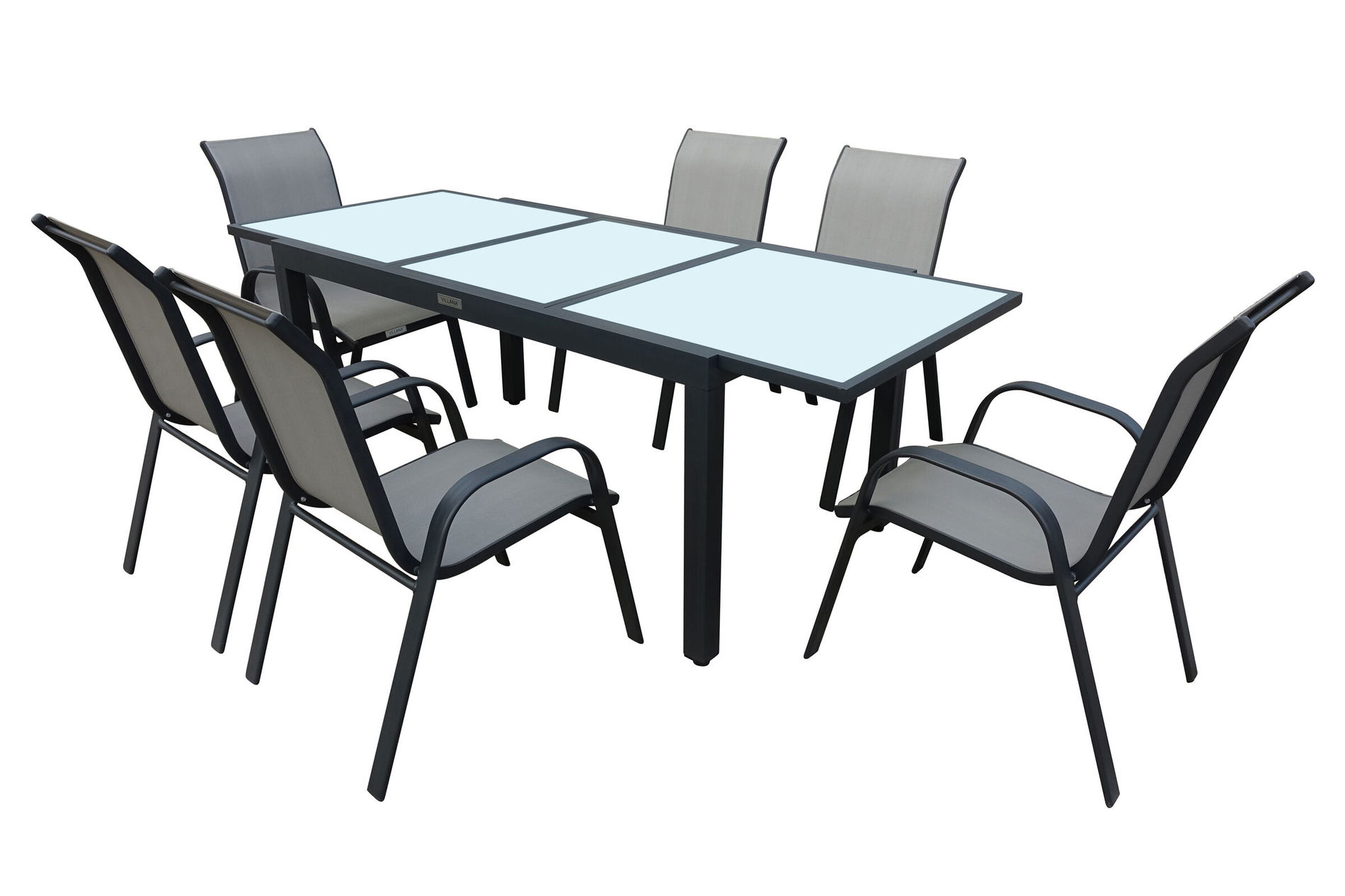 VILLANA Garten-Essgruppe, anthrazit/grau, Alu/Textil, Ausziehtisch 160/220cm, 6 Stapelstühle