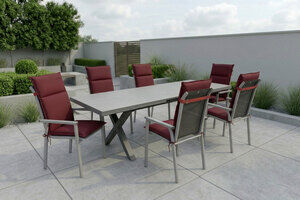 KETTLER BasicPlus Pro Garten-Essgruppe, silber/bordeaux, Alu/Steinimitat/Polyester, 200/260x100cm, 6 Stapelsessel, Polster inklusive