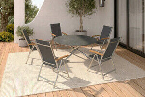 OUTFLEXX Garten-Essgruppe, silber/schwarz, Edelstahl/Glaskeramik/Textilene/Teakholz, Tisch Ø150cm, 5 Klappstühle, verstellbar