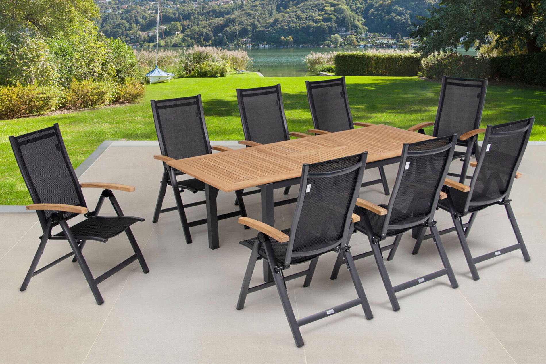 OUTFLEXX Garten-Essgruppe, OUTFLEXX® anthrazit matt, Alu / Teak / Textil, Tisch 150/210x90cm, 8 Klappstühle