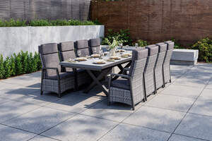 OUTFLEXX Nova Garten-Essgruppe, schwarz/anthrazit/grau, Aluminium/Polyrattan/Steinimitat, Tisch 200/260 x 100 cm, 8 Diningsessel