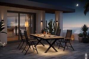 OUTFLEXX Luminara Garten-Essgruppe mit LED-Beleuchtung, anthrazit matt/natur, Aluminium/Textilen/Holzimitat, Tisch 240 x 100 cm, 4 Klappstühle