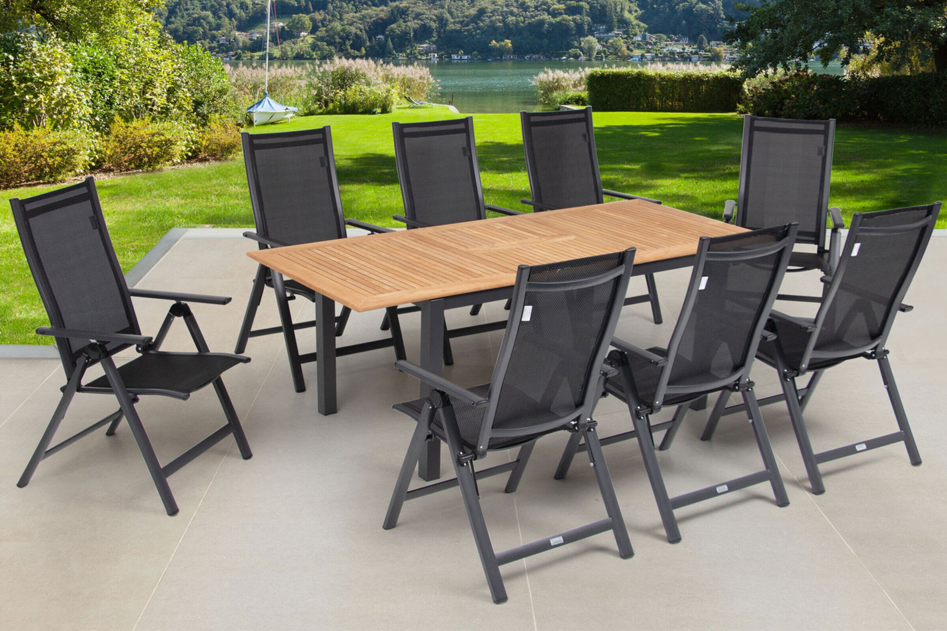 OUTFLEXX Garten-Essgruppe, OUTFLEXX® anthrazit matt, Alu / Teak / Textil, Ausziehtisch 150/210 x 90 cm, 8 Klappstühle