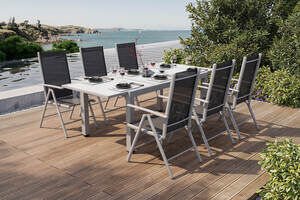 VILLANA Garten-Essgruppe, silber/schwarz, Alu/Textil, Tisch 160/220 cm, 6 Klappstühle