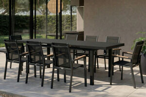 OUTFLEXX Premium Garten-Essgruppe, OUTFLEXX® anthrazit matt, Alu / Glas / Teak, Tisch 180/240x100cm, 8 Stapelsessel
