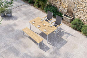 VILLANA Tasmania Garten-Essgruppe mit Bank und 2 Klappstühlen, silber/natur, Aluminium/Eukalyptus, Tisch 180 x 90 cm, FSC®-zertifiziertes Produkt